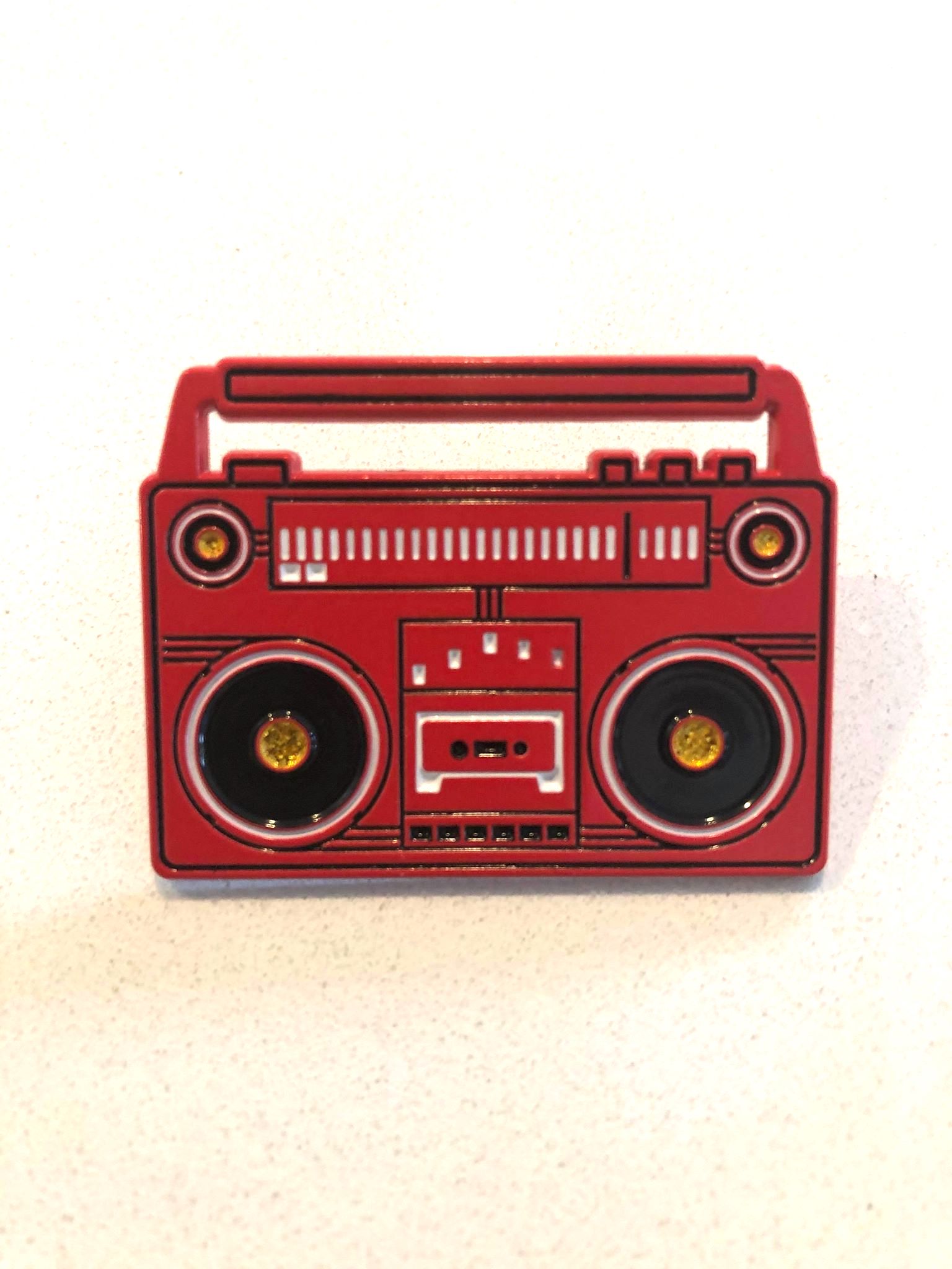My iconic red boombox inspired this pin, which features gold glitter in the middle of each speaker. It is a limited edition of only 100 pieces- with laser etched number on the back. Measures 1.75" wide with double posts. Comes to you on an oversized backer card featuring art by Lindsey Gilbert.